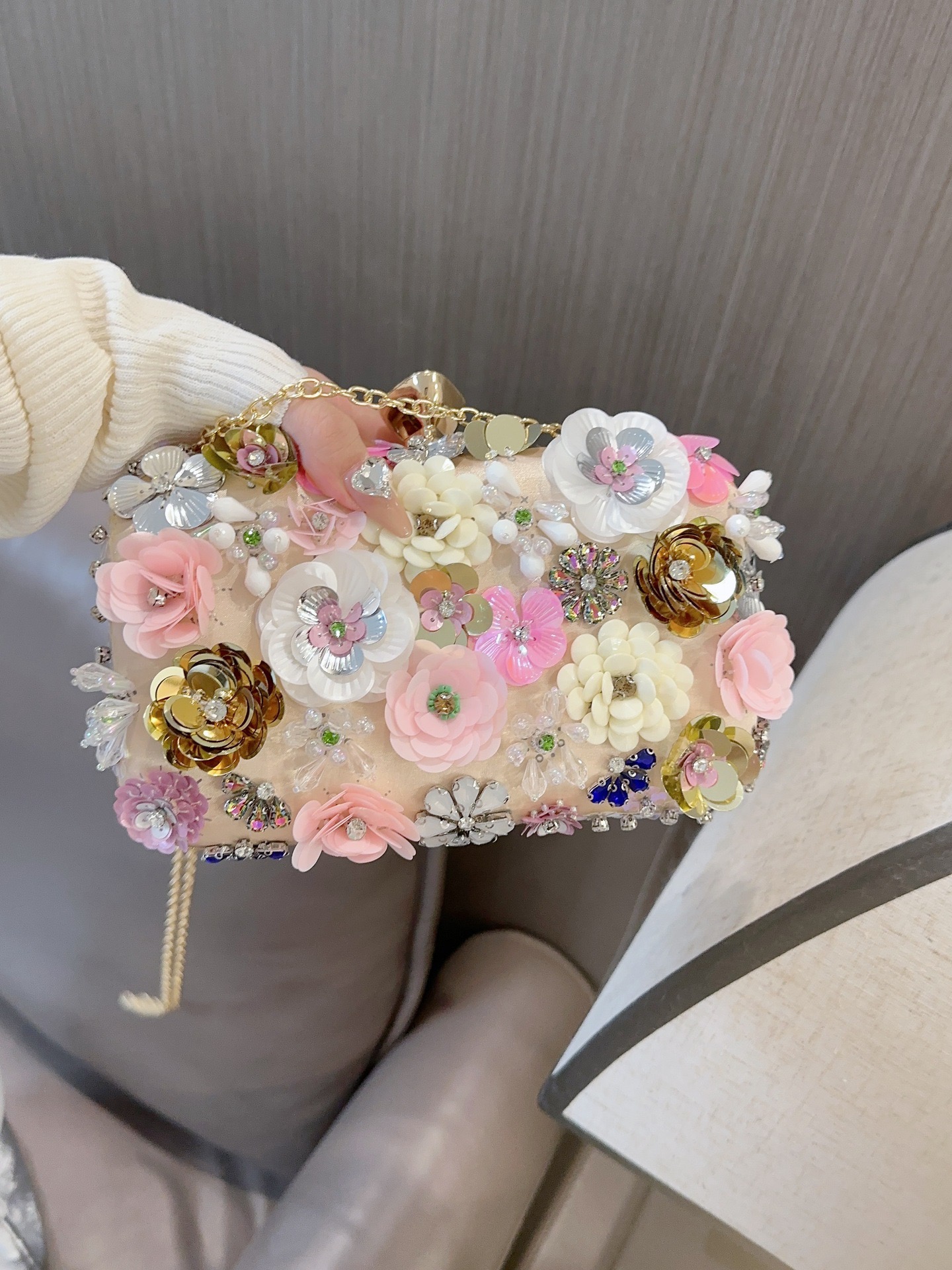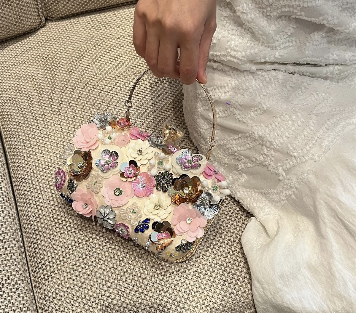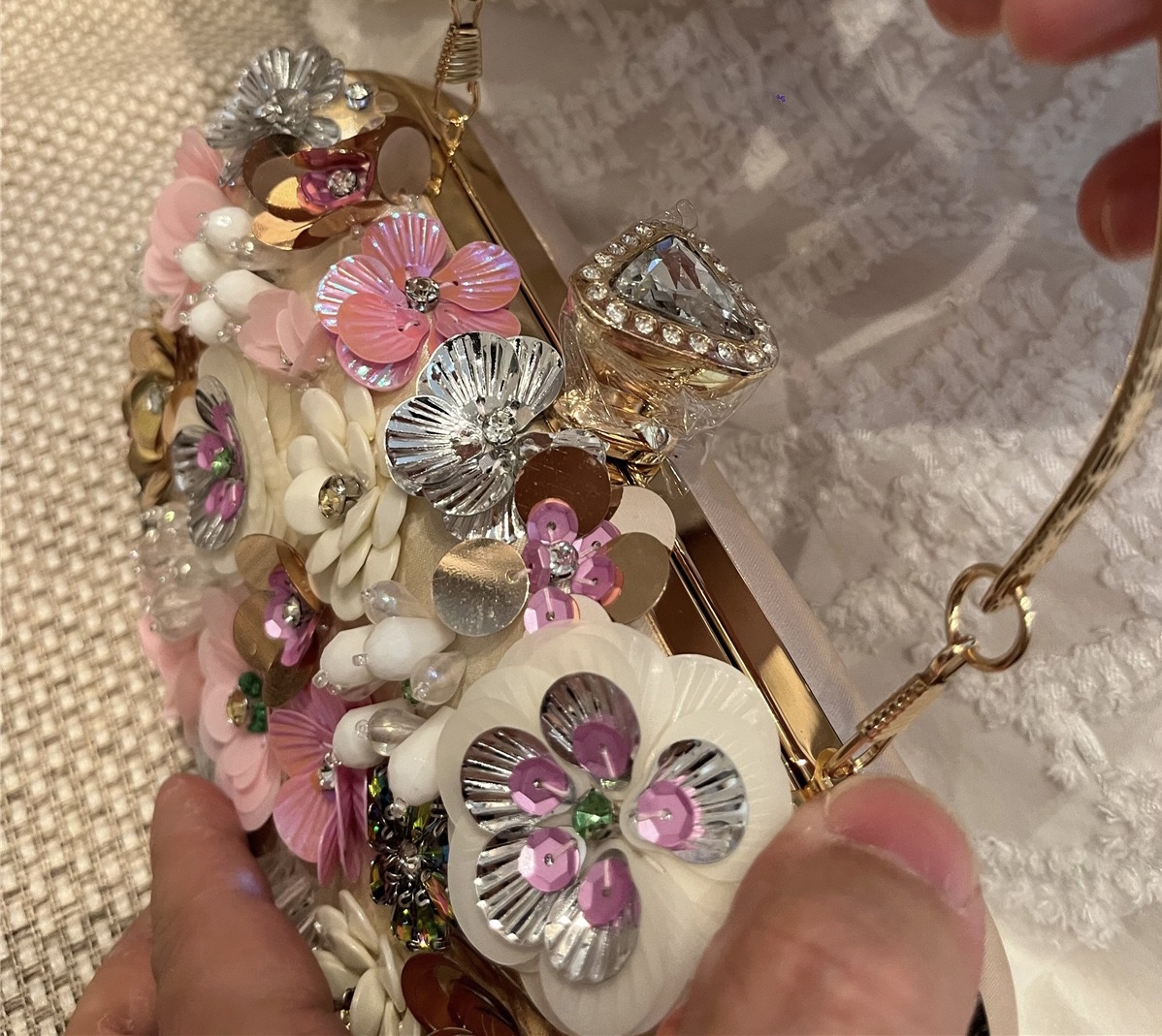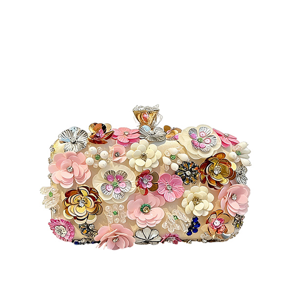 This exquisite evening clutch is a wearable work of art, adorned with a lush array of 3D floral embellishments. Each delicate flower is crafted from shimmering sequins, soft fabric petals, and lustrous pearls, creating a multi-dimensional, romantic texture. The structured frame keeps your essentials secure, while the compact silhouette makes it perfect for pairing with evening gowns, wedding dresses, or formal attire. Elevate your special occasions with this statement piece that blends vintage charm and modern luxury.