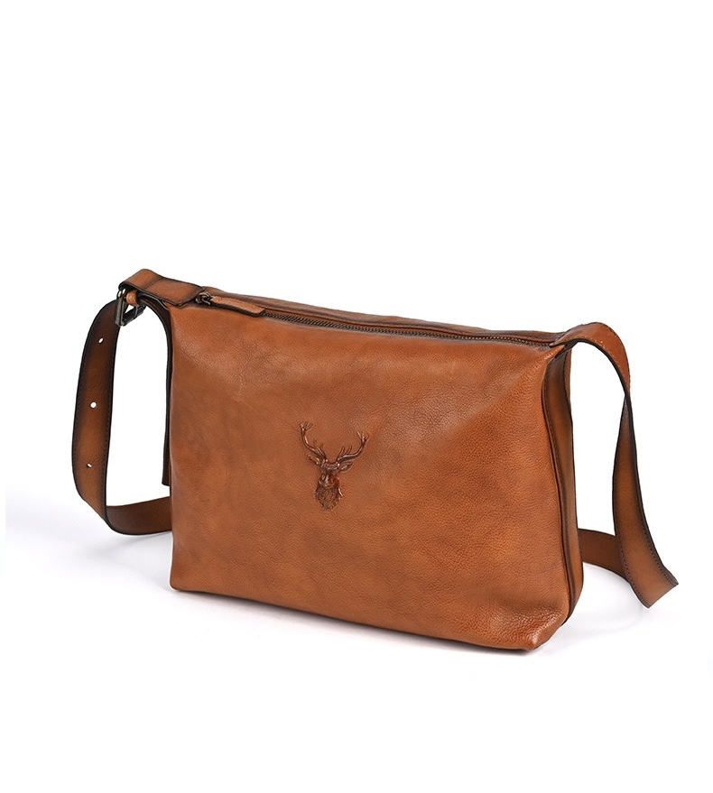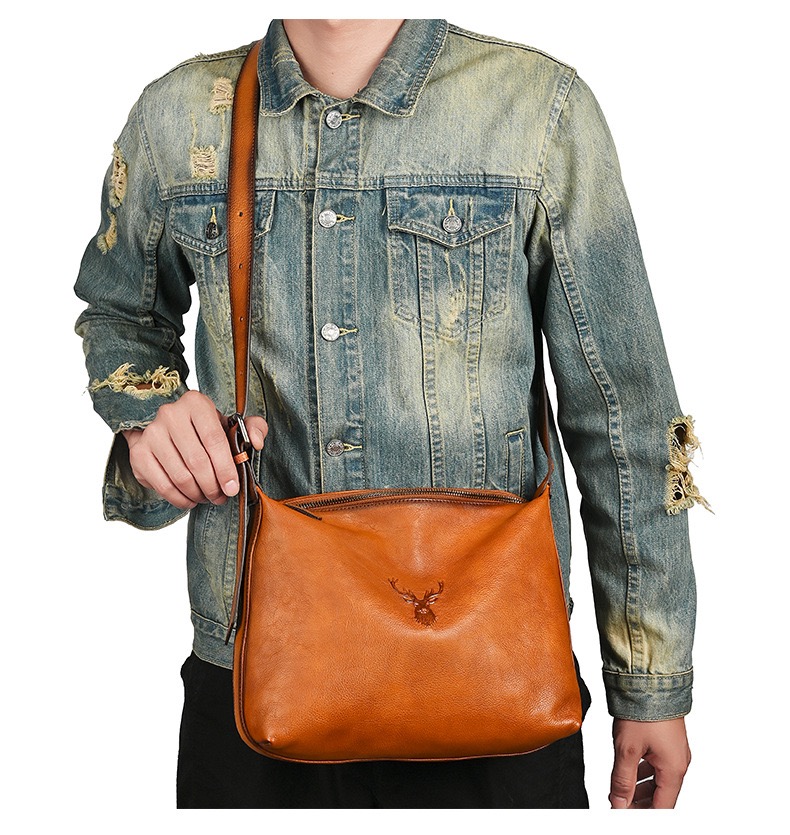 Crafted from premium full grain vegetable-tanned leather, this men’s vintage crossbody bag combines timeless retro charm with everyday practicality. The soft, supple leather develops a rich patina over time, while the spacious main compartment keeps your daily essentials organized. An adjustable shoulder strap ensures comfortable, hands-free carry, making it perfect for work commutes, casual outings, and weekend adventures. The embossed deer head detail adds a distinctive, rustic touch, elevating your look with authentic craftsmanship and understated style.