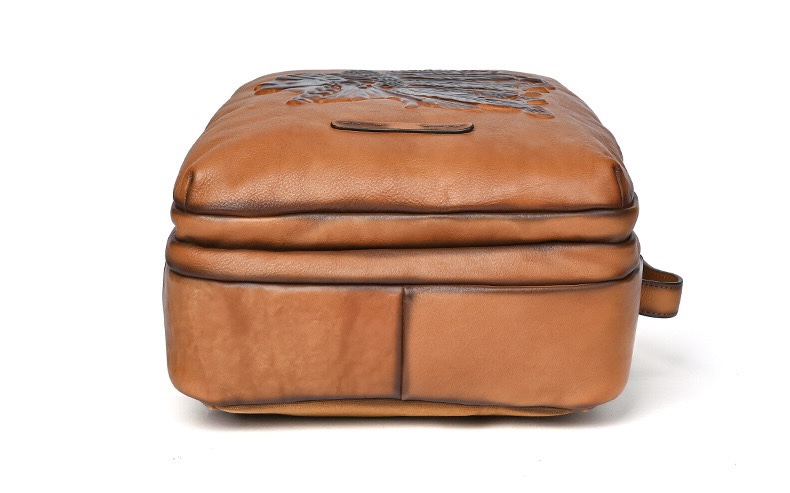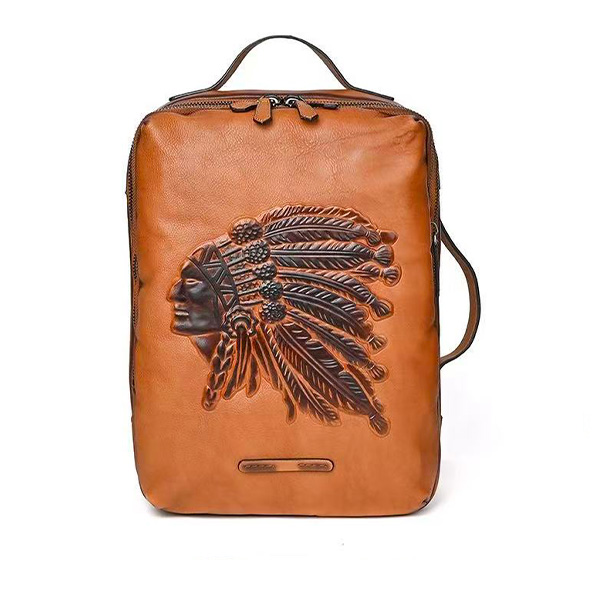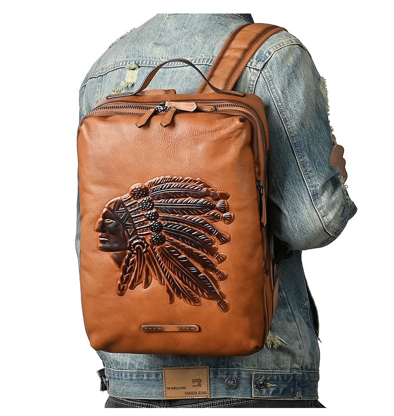 Crafted from 100% full grain vegetable-tanned cowhide leather, this backpack features a hand-embossed Indian chief pattern for a bold vintage style. The durable, soft leather develops a rich patina over time, while the spacious design fits most laptops up to 15.6 inches. With multiple compartments, adjustable straps, and a top handle, it offers practicality for commuting, travel, and casual use—perfect for the modern man who values authentic craftsmanship.