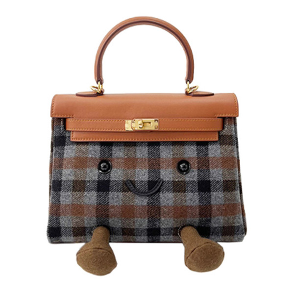 This Grey Black Plaid Smiley Tote Bag blends retro checkered charm with playful personality. Crafted from textured grey-black plaid fabric and paired with a smooth brown leather top handle, it balances classic sophistication with whimsical details like the friendly smiley face and optional plush legs. The gold-tone hardware adds a touch of luxury, making it versatile for casual outings, coffee dates, or festive occasions.