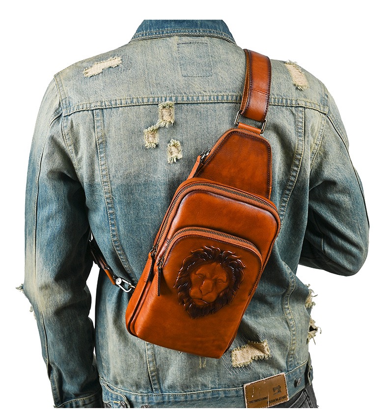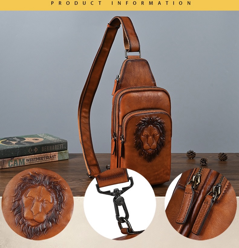 Crafted from premium genuine leather, this Fale Amanni men’s sling bag blends casual fashion with everyday practicality. The embossed lion head detail adds a bold, masculine touch, while multiple zippered compartments keep your phone, wallet, and essentials organized. An adjustable strap ensures comfortable hands-free carry, making it ideal for commuting, travel, and casual outings—perfect for the modern man who values style, durability, and versatility.