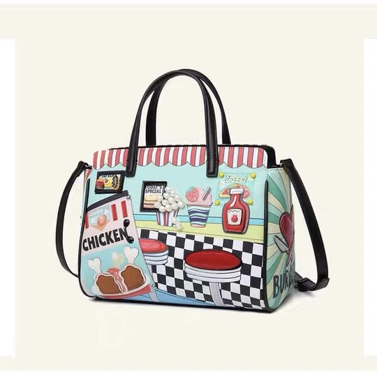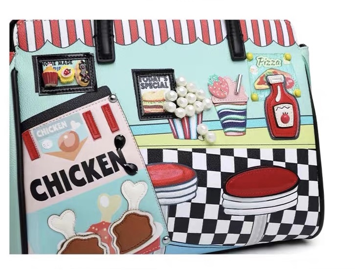 This playful tote bag captures the nostalgic charm of a 1950s American diner, with a vibrant 3D appliqué scene featuring a hot dog, soda cup, jukebox, and classic checkered flooring. The bold red-and-white striped awning and retro color palette evoke carefree summer days, while the sturdy black top handles offer comfortable carry for daily use. Spacious enough to hold your essentials, this bag is a wearable piece of pop art that adds whimsy and personality to any casual outfit—perfect for weekend outings, coffee runs, or retro-themed events.
