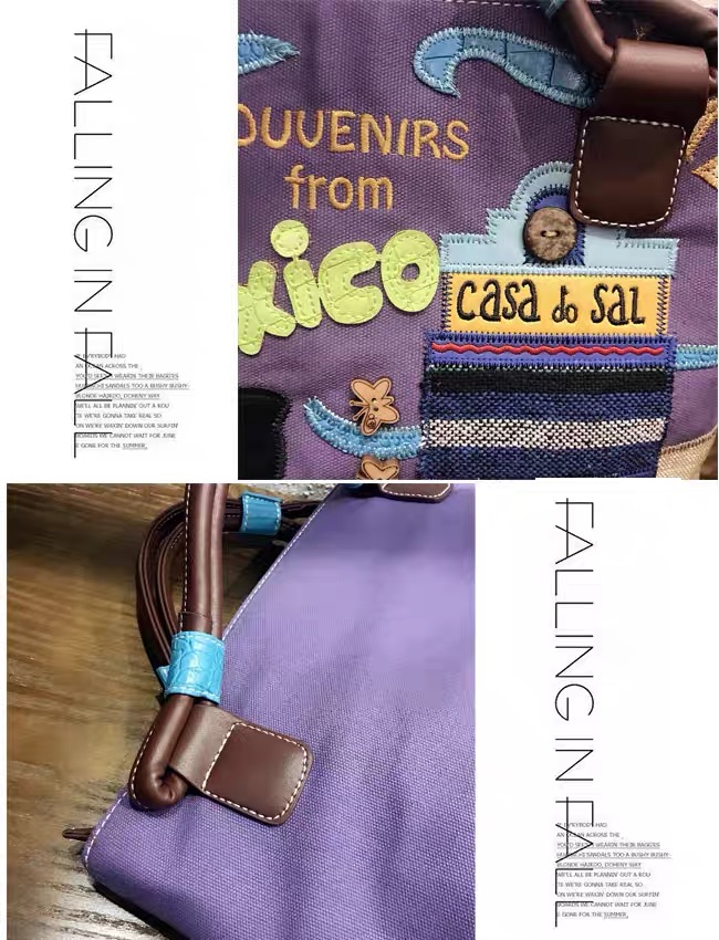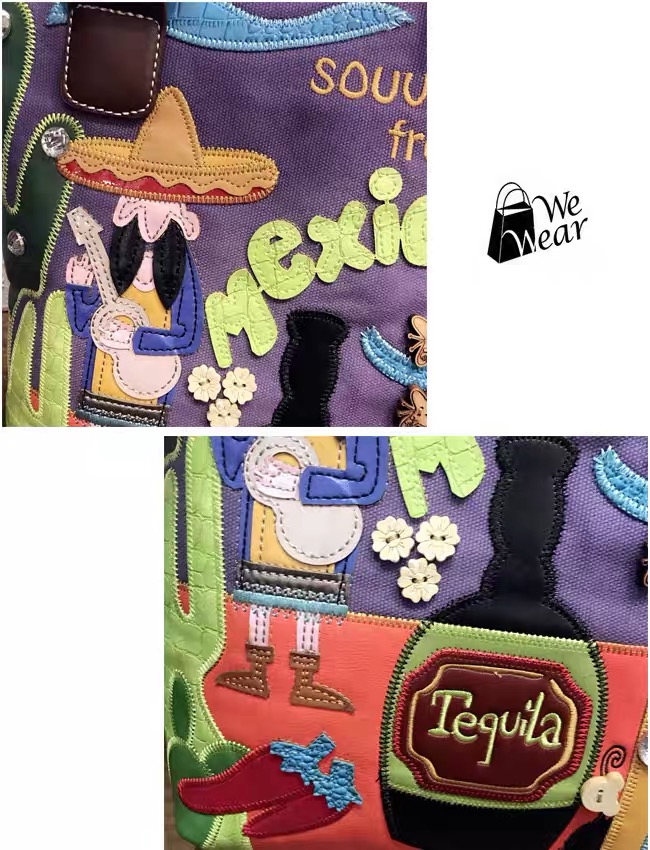 This vibrant tote bag brings the lively spirit of Mexico to your everyday look, adorned with playful appliqué and print details—including a mariachi musician, tequila bottle, cacti, chili peppers, and iconic colonial architecture. The bold color palette and “Souvenirs from Mexico” lettering evoke the warmth and charm of Mexican culture, while the sturdy dual handles offer comfortable carry for daily use. Its spacious silhouette is perfect for stowing essentials, making it ideal for weekend getaways, casual outings, or as a unique travel souvenir. Crafted with durable materials, this bag is a wearable celebration of Mexican folk art and joy