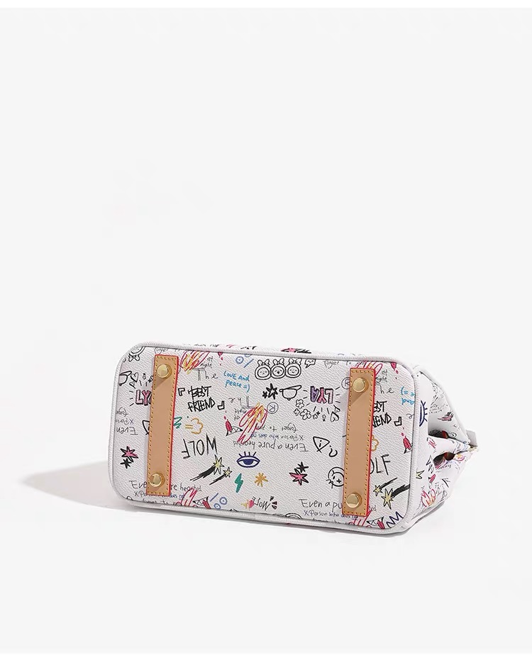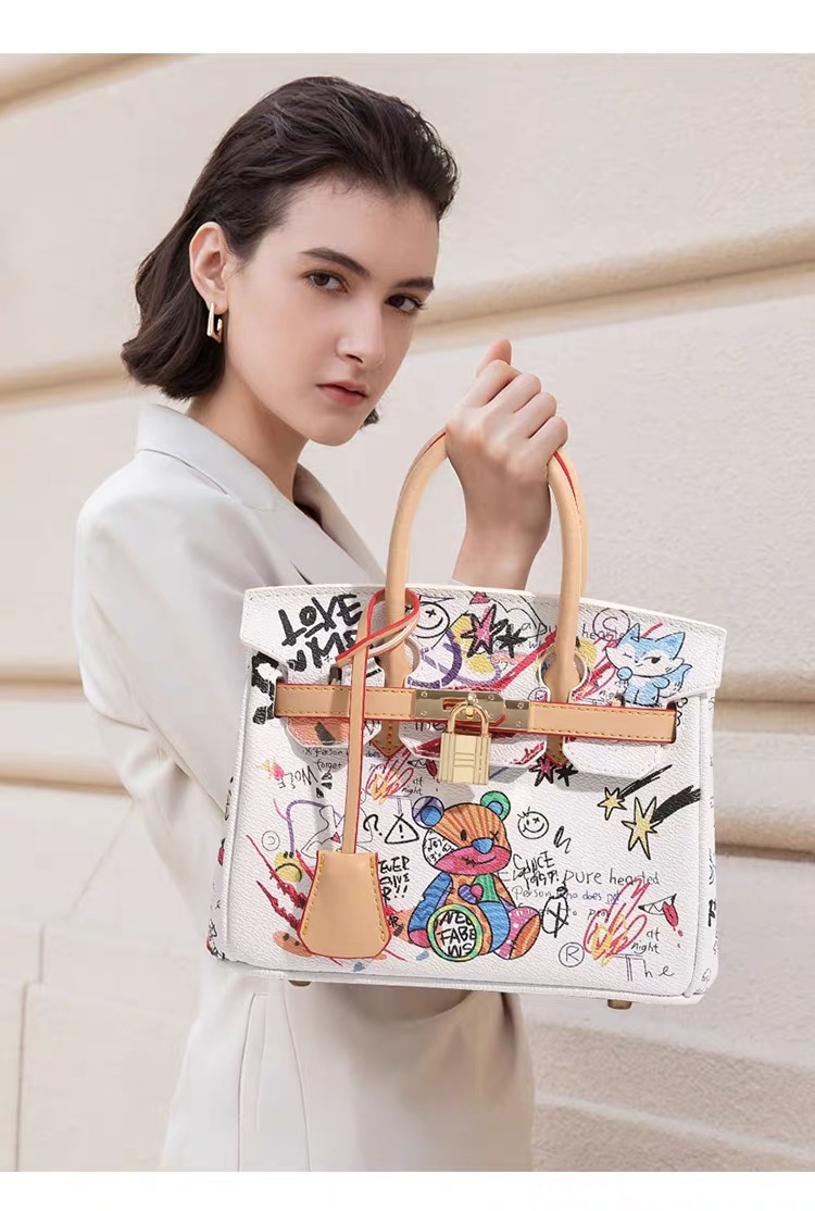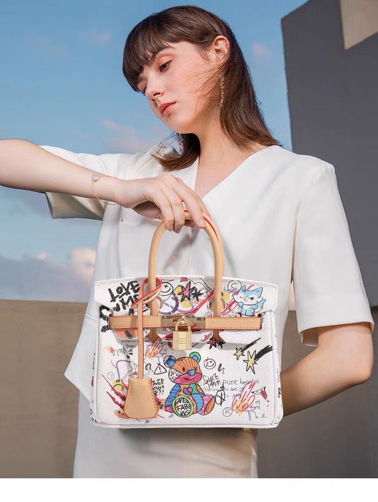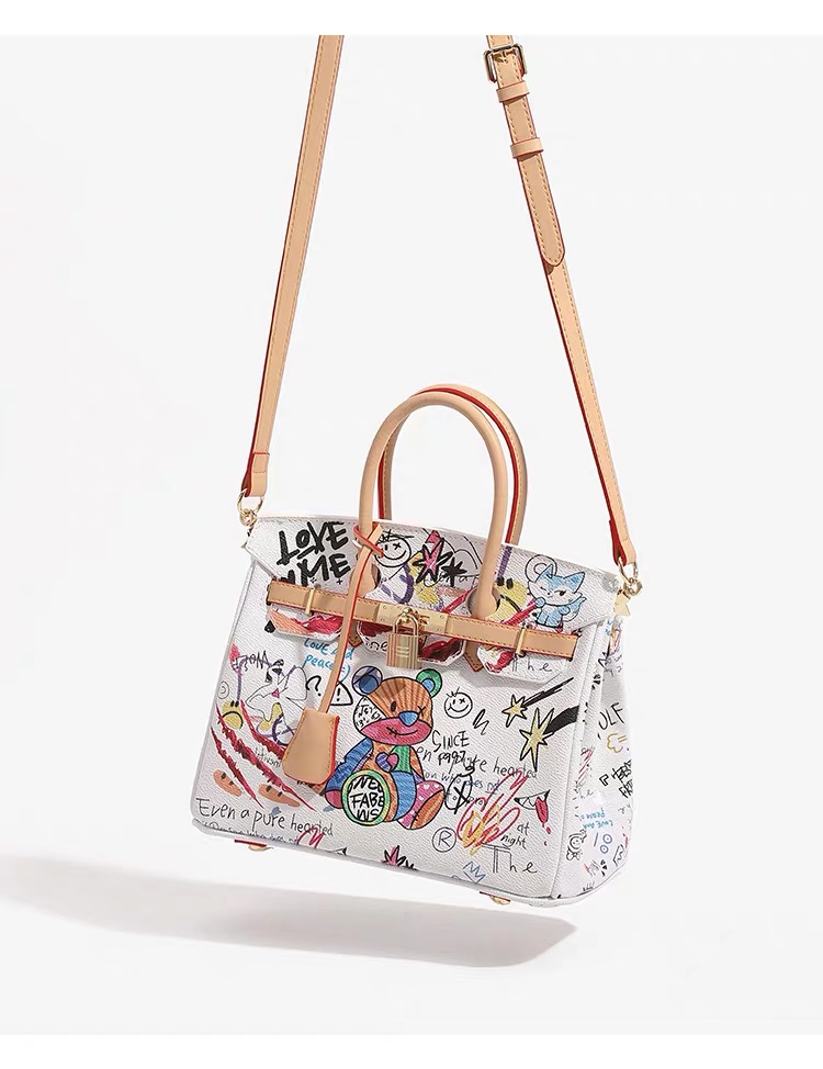This statement handbag merges classic luxury with bold street art, featuring playful “Love Me” motifs and vibrant teddy-bear graffiti. Designed for trendsetters who blend elegance with unapologetic self-expression, it transforms everyday style into a wearable art piece that captures youthful energy and creative confidence.