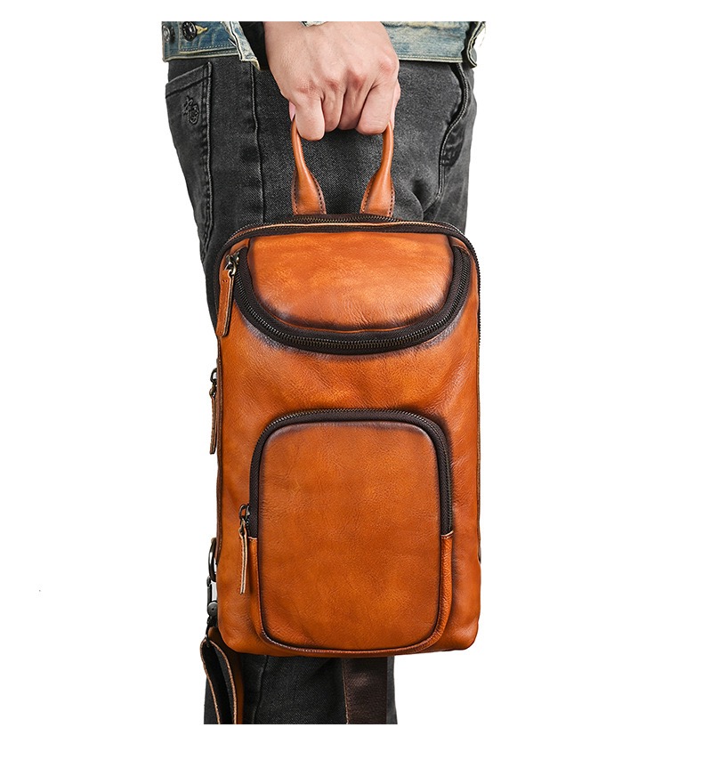 Crafted from premium top grain cowhide leather, this men’s sling bag blends high-end craftsmanship with bold, trendy design. Featuring multiple zippered compartments and a spacious main pocket, it offers ample storage for your camera, phone, wallet, and other daily essentials—making it perfect for outdoor adventures, travel, and daily commuting. The adjustable shoulder strap and top handle provide versatile carrying options, while the rich, distressed leather finish develops a unique patina over time, adding character to your look. Durable, stylish, and functional, this leather chest bag is the ultimate accessory for the modern man who values both fashion and practicality.